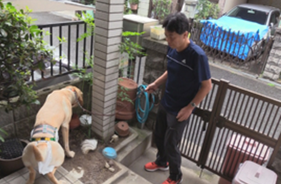 (映像:門川さん、ベイスと一緒に自宅を出てくる。雨模様。)
