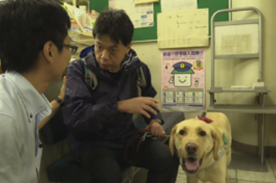 (映像:再び訓練センターの様子、田中訓練士と話をする門川さん、指点字通訳の女性から通訳を受けている。)