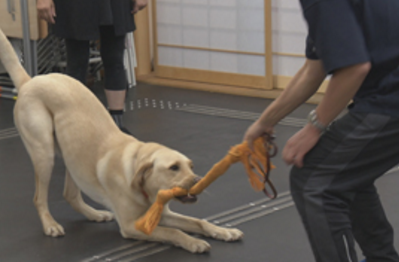 (映像:すまいるで門川さんにひもで遊んでもらうベイス。そばで田中訓練士が遊び方を指導している。)