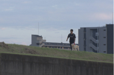 (映像:淀川の側道をベイスと歩く門川さん。いい天気。)