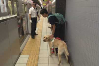 (映像:ベイスと一緒に地下鉄に乗り込む門川さん。改札口の駅員が「どうぞ」と手を差し出している。ホームに車両が止まっている。ホームドアが設置されている。)