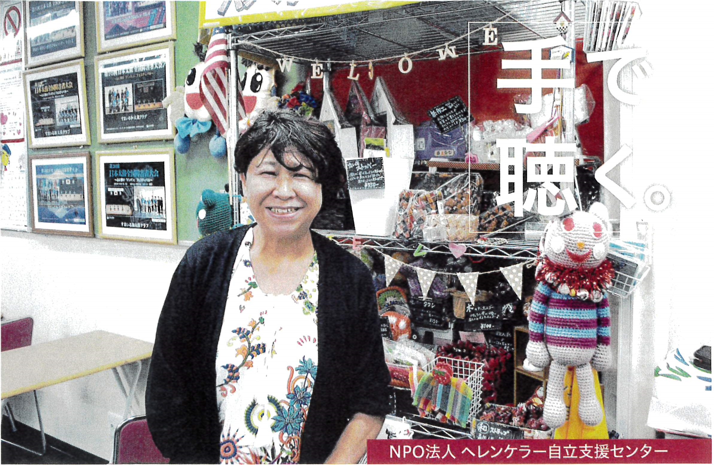 「ろう者の団体から料理教室の講師の依頼があった時、盲ろう者が参加していた。教室が始まり、説明をしている時に1人だけ前に出てこない男性がいた。時々その人を見ると、となりの男性と手を繋いでいて、恋人同士なのかと思った。でもそれが触手話であり、盲ろう者と初めて出会った瞬間でした。こんなに身近に盲ろう者がいるのかとショックを受けました。もともと自身が聴覚障がいをもっていること、主人の父が視覚障がい者だったことから、日頃から2人で一人前だと思っていたが、盲ろうという状態が身近にあるという事実に驚き、聞こえないが為に目を酷使している自分もいずれそうなるのではないかと不安に思ったことが何か支援したいと思ったきっかけでした。」 センターを利用する方は全盲ろう、全盲難聴、弱視難聴、弱視ろう、病気などで中途失明失聴を患った人等様々で、触手話や指点字、手のひら書き、メガホンの使用など通訳もその数だけありコミュニケーション方法は多岐にわたるとのこと。触手話とは手話をする手を直接触りながら読み取る言語のことです。視覚も聴覚も持たず、外部から得られる情報が極端に少ない盲ろう者。家族とのコミュニケーションにも苦労し孤立しがちな彼らが、触手話によって情報を得るだけでなく、仲間ができコミュニティが広がるのです。