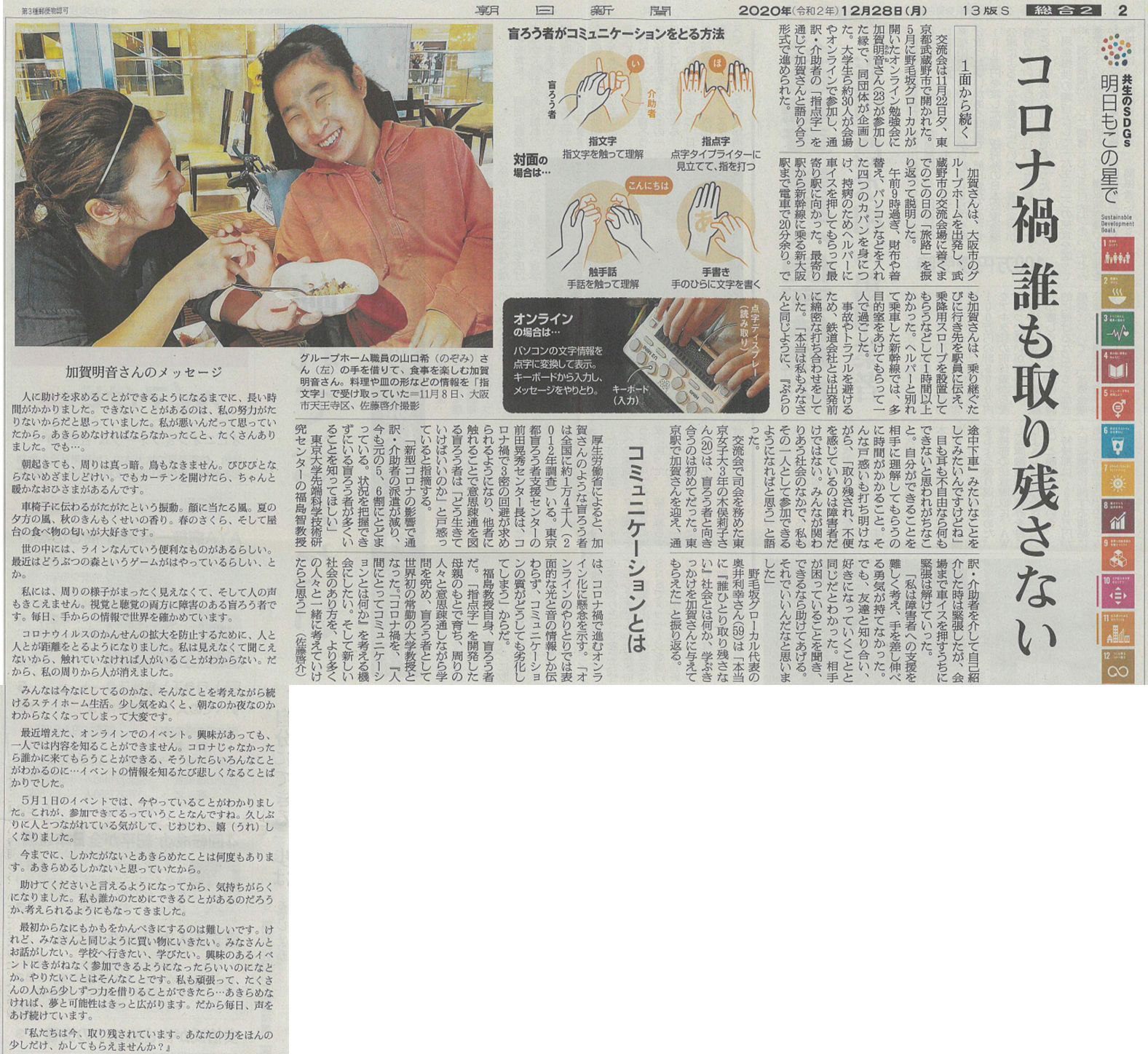 目も耳も不自由なら何もできないと思われがちなこと。 自分ができることを相手に理解してもらうのに時間がかかること。 そんな戸惑いも打ち明けながら、「取り残され、不便を感じているのは障害者だけではない。 みんなが関わりあう社会のなかで、私もその一人として参加できるようになればと思う」と語った。