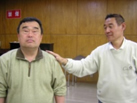 盲ろう者の横に並びます(横並び)。盲ろう者の左右の手の人差し指・中指・薬指の上に、あたなの左右の人差し指・中指・薬指を同じ位置で重ねます。