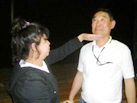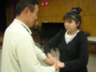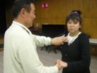 | 盲ろう者があなたに気がついてくれたら。。。 次に、あなたの名前をつたえましょう。 伝え方はどんな方法でもOKです。 (手の平にかな文字を書いて伝える(手書き文字)、指文字で伝える、など) |