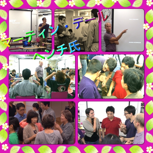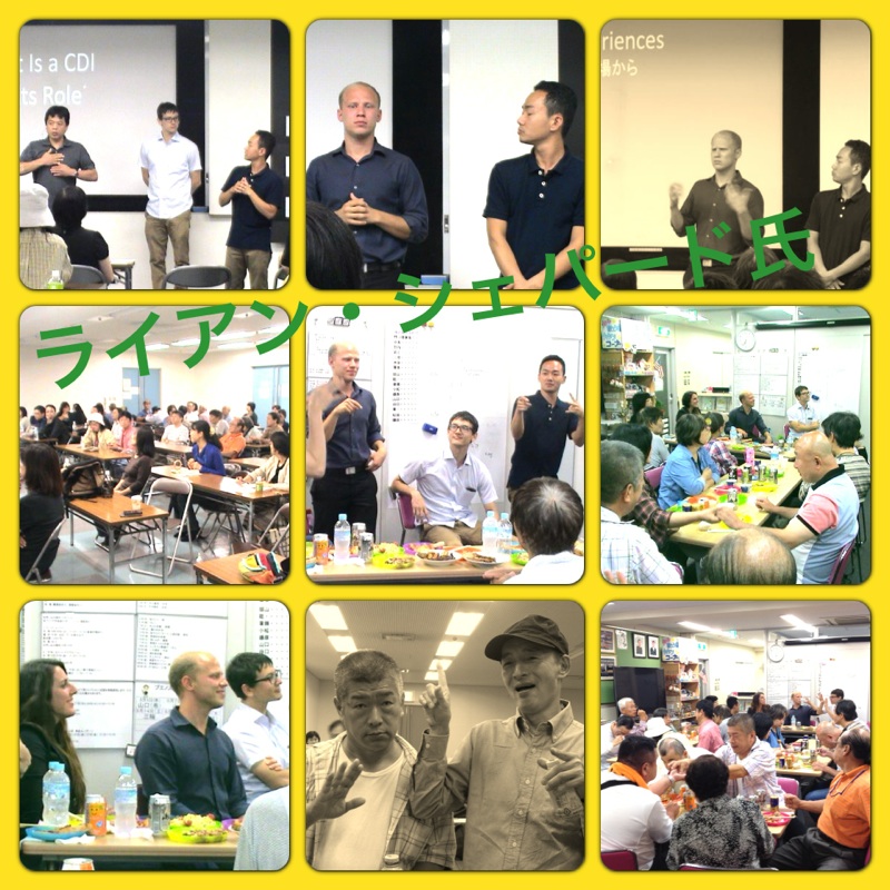 アメリカにはろう者を対象とした「手話通訳士資格制度」があり、多くのろうの手話通訳者が活躍しています。ライアン・シェパード氏もそのお一人です。 豊富な通訳経験と専門知識は高い評価を得てされる講演会は本当に素晴らしく興味深いものとなりました。 講演後は、場所をすまいるに移してライアン氏とフリーモントのろう学校で英語、ASLなどを指導され現在もアメリカ手話講師として評判のマーティン・デール-ヘンチ氏、そしてお友達のベスさんを囲み親睦会となりました。すまいるからは歓迎の気持ちを込め、パントマイムのお披露目も!みんなで飲んで食べての楽しい時間もあっという間に過ぎました! 翌日は引き続きライアン氏とマーティン氏の指導によるワークショップです!!--------------------