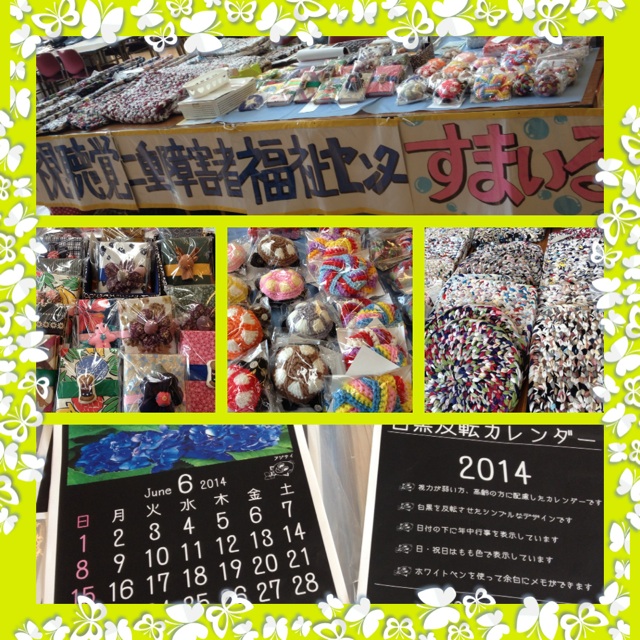 すまいるからはバザーを出店しました。今回の新作は「すまいるカレンダー」です。2種類のすまいるカレンダーは1つ目は季節のお花のカレンダー、2つ目はすまいるの活動風景の写真達。 見事にすまいる活動風景のカレンダーは初日で完売。24日にも追加するほどに!お花のカレンダーも半分購入頂き、 新作としてまずまずの出だし! 是非是非!すまいるカレンダーを購入してくださいね。