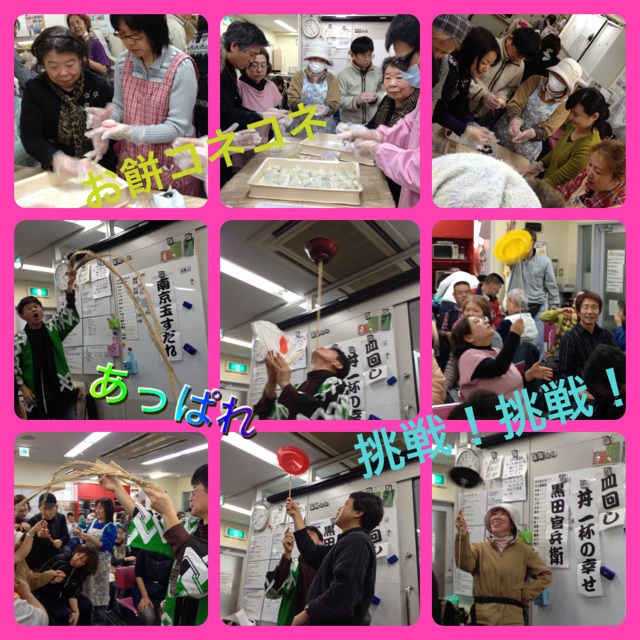出来たばかりのアツアツのお餅を皆で「熱い!熱い!!」と言いながらコネコネ丸めます。あんこ入りに、海老入りに、しょうゆに海苔に、きな粉に、ぜんざい、雑煮まで!種類も豊富に揃い、皆のお腹もはち切れんばかりになりました。 お餅をたくさん食べた後は、ろう者Nさんのパントマイム。続いて兵庫県からいつもすまいるのイベントにはご夫婦で参加してくれるご主人Dさんの「南京玉すだれ」。これまたスゴ技が続きます!