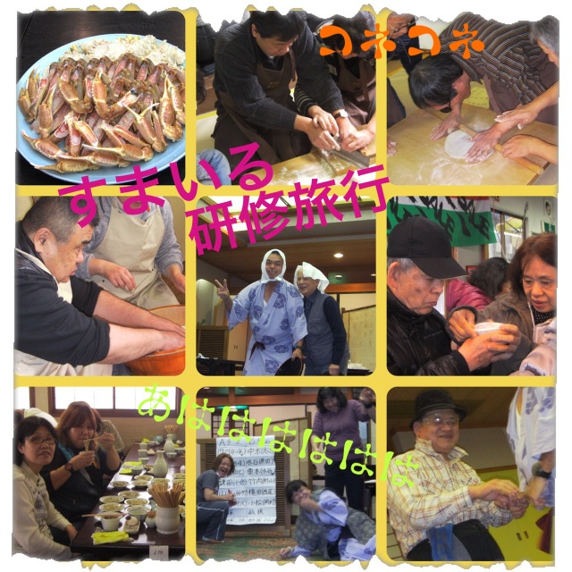 その後、奥城崎にあるホテルに向かいました。今回の旅行の目玉は、なんといっても晩ご飯のカニです!晩ご飯はカニ三昧!!生ガニ、茹でガニ、焼きガニ、カニ鍋など、いろんな食べ方で楽しみました。 みんな黙々と食べていて、静かすぎてビックリ!でも、宴会の中のレクリエーションや出し物では、すまいるらしい賑わいでした。