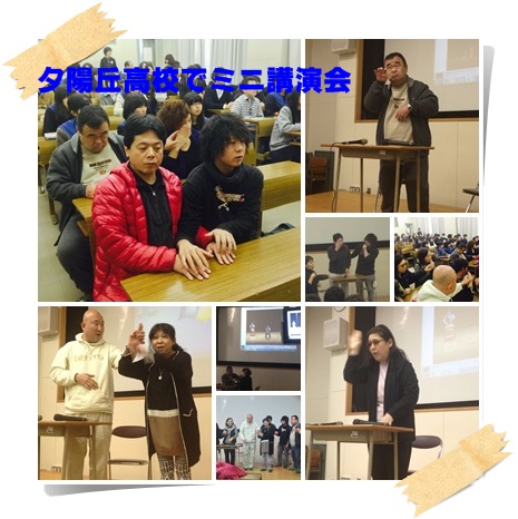 3月4日(火)、夕日丘高校で「障害について知ろう!」をテーマとした授業が行われ、 すまいるの盲ろう者4名がミニ講演会を行いました。