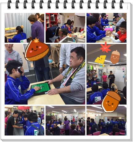 11月11日(金)、夕陽丘中学校の1年生、10名がすまいるに来てくれました。オセロ、さおり、マット作り、紙細工、コミュニケーション、カレー作り、とグループに分かれて、盲ろう者と交流。オセロではアイマスクをつけたとたん、「うわ、見えない。わからない」「難しいな」と声があがりました。