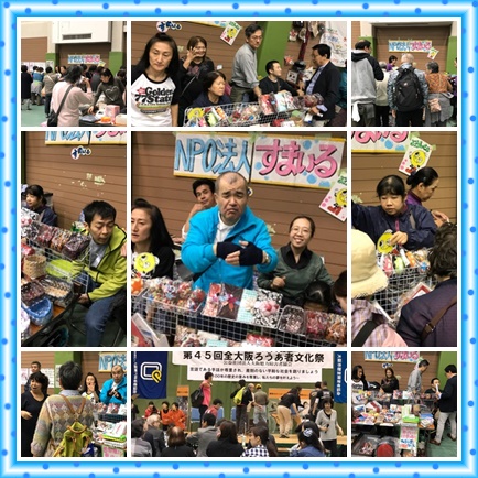 10月22日(日)、第45回全大阪ろうあ者文化祭に参加しました。この日近畿には台風21号が接近していましたが、なんとか開催することができ、ひとまず安心。外は大雨でしたが会場はいっぱいの人で熱気むんむん。すまいるは盲ろう者が交代でバザーの担当をし接客です。お客様の呼び込みに、会計に、はたまた久しぶりの仲間とのおしゃべりにと大忙し。やっぱり楽しい!