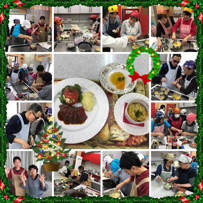 今日のメニューはクリスマス料理。ローストビーフ、ほうれん草とベーコンのフラン、スタッフドトマト、オレンジゼリーです。普段なかなか自宅では作ることのないメニューですが、講師の方のご指導もあり、みなさんそつなくこなされていました。