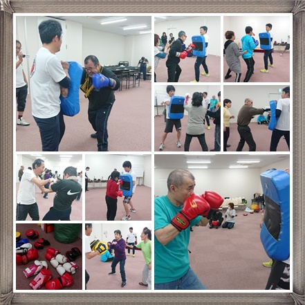 最初はボクシングの基本の構えである「ボックス(ファイティングポーズ)」の練習から始め、徐々にパンチの練習をしていきます。形を覚えたら、実際に講師のパンチングミットに打ち込みです。ワンツーフック・ワンツーアッパーとリズムよく、ミットを叩く音が会場に響き渡りました。