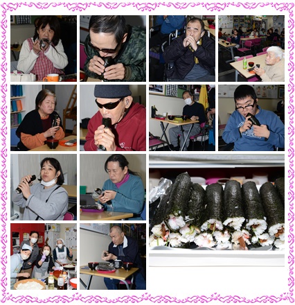 お昼になったら全員で、今年の恵方「南南東」に向かって恵方巻をほおばります。いつもはにぎやかなすまいるですが、この日ばかりはみなさん無言。願い事が叶うよう、おしゃべりは我慢して丸かぶりです。