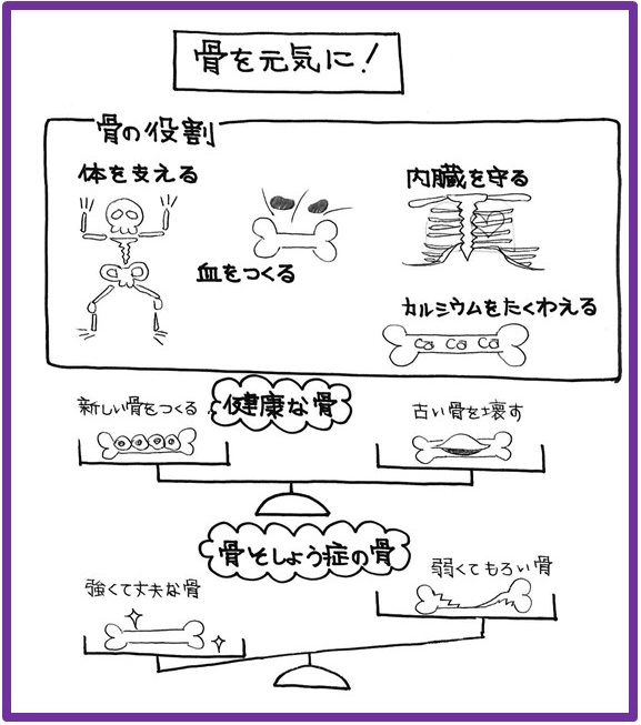 骨は体を支え、内臓を守っています。骨を作るためには、食事からカルシウムを取り入れる必要があります。体は新しい骨を作ったり、古い骨を壊したりを繰り返し、体の中の骨の量を一定に保っています。しかし、骨を壊す量が多くなると、骨粗しょう症になります。そこで、骨の薬の登場です。