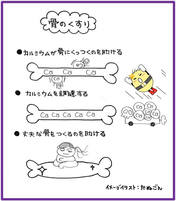 ●骨を作るためのカルシウムを調達する薬骨から血中にカルシウムが流れ出るのを防ぎ、カルシウムが骨に取り込まれるのを助けます。