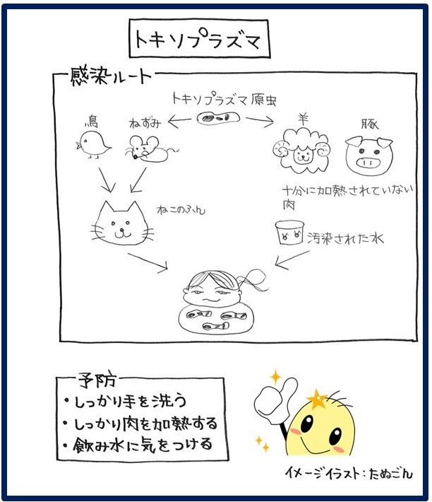 人間もトキソプラズマに感染することがあります。主に、猫のふんのそうじやガーデニング中にあやまって猫のふんに触れたり、汚染された水や加熱が不十分な肉を接種したりして感染します。健康な人は感染しても特に問題になりませんが、妊婦さんや体の免疫が低下している人は注意が必要です。トキソプラズマに感染すると、人間も脳の神経に障害が起こります。