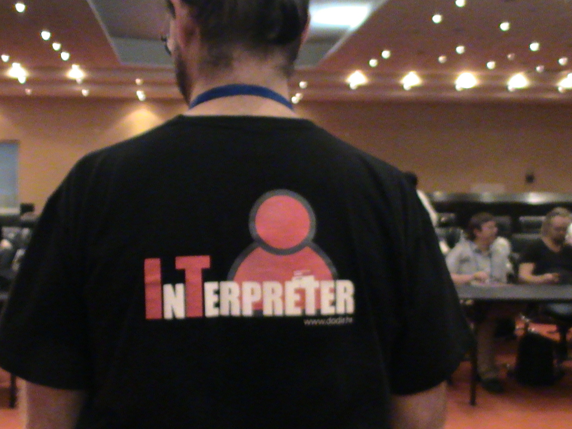 <写真:通訳者のTシャツ(背中にINTERPRETERのプリント)>