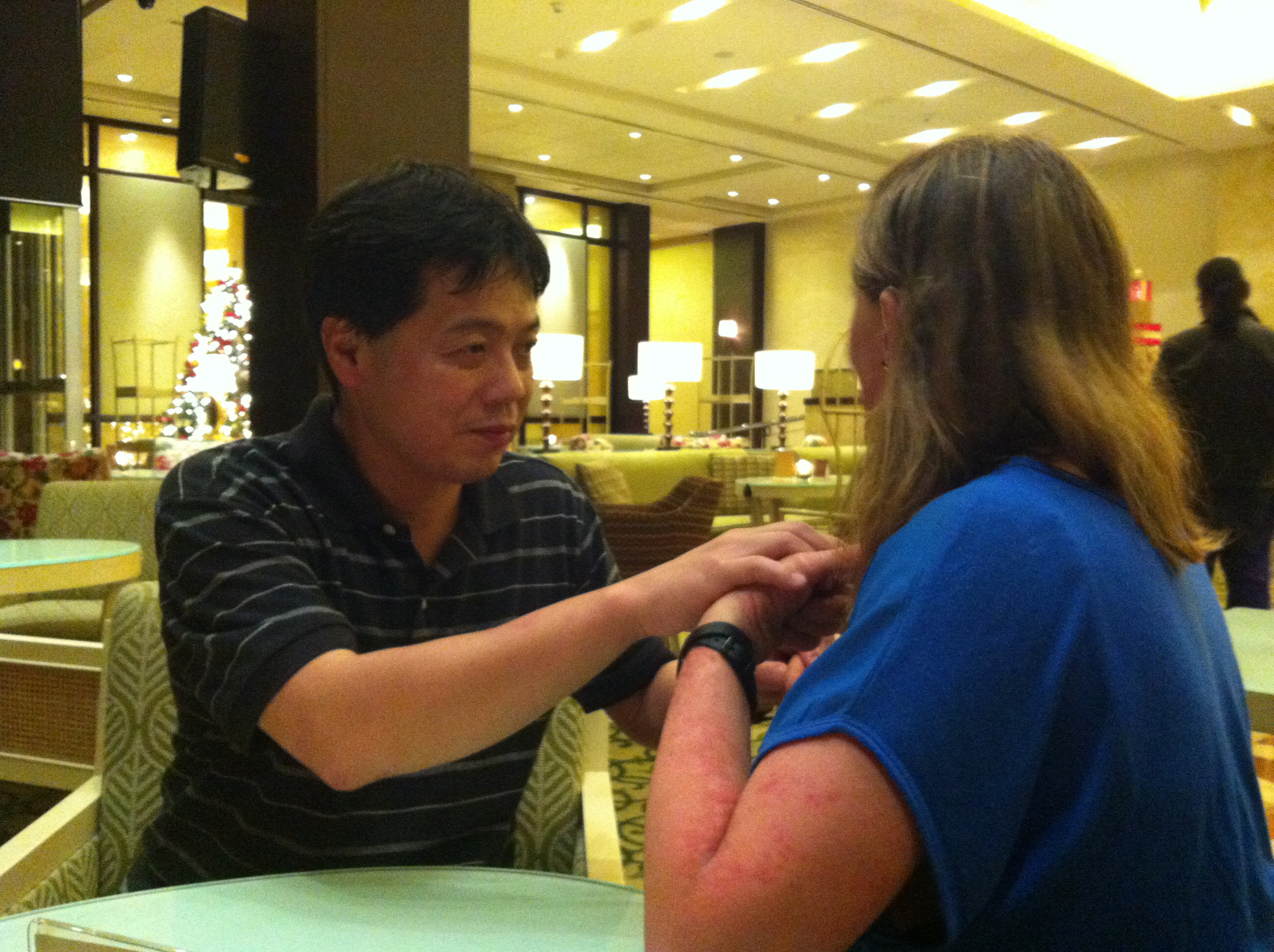 <写真:触手話通訳(対面になり両手で触手話通訳を受ける。腕が疲れないようにクッションのついた机に肘をついている。)>