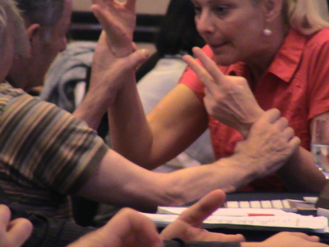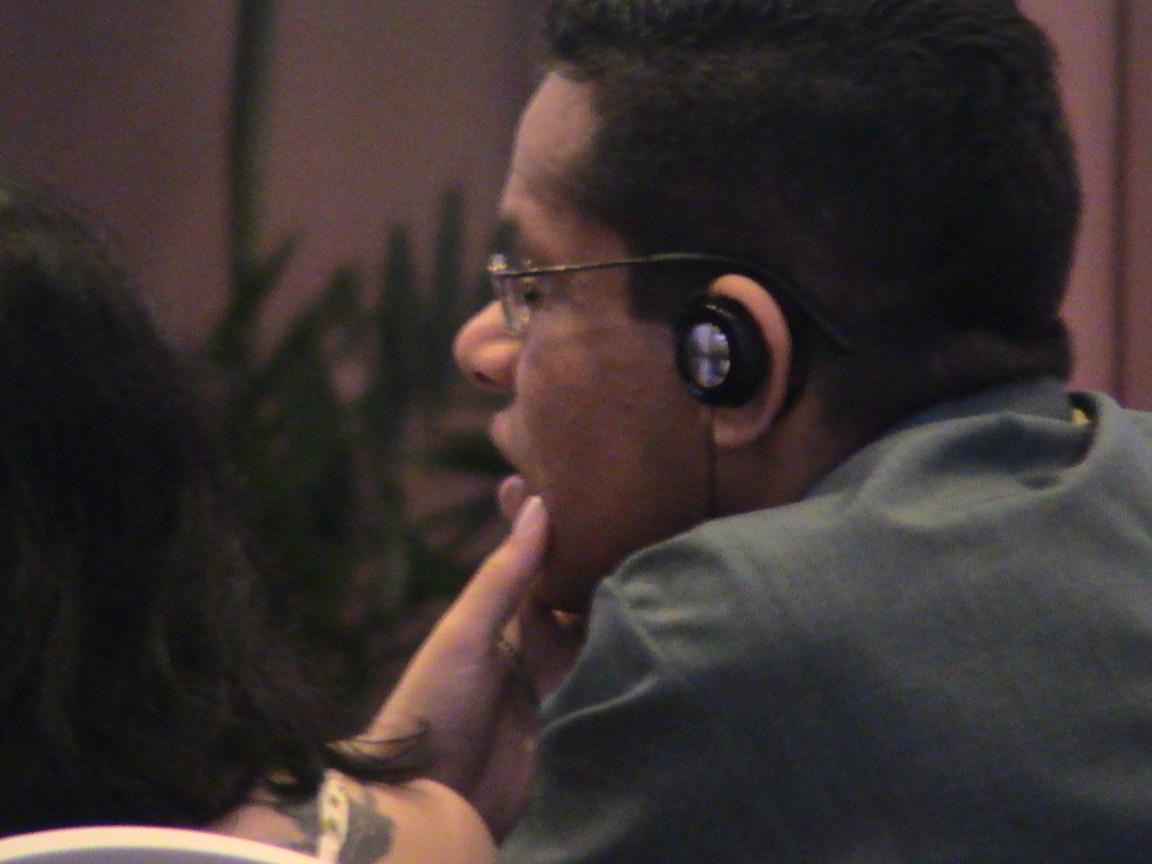 一つすばらしかったことをご紹介します。北欧のチームが補聴用のシステムを持参し、難聴者やスペイン語の言語通訳が必要な人が利用していました。この機器のセッティングやメンテナンス、または会議中に不具合が生じた時の対応などは、担当者の盲ろう者自身が通訳を介して、全て取り仕切っていたことです。