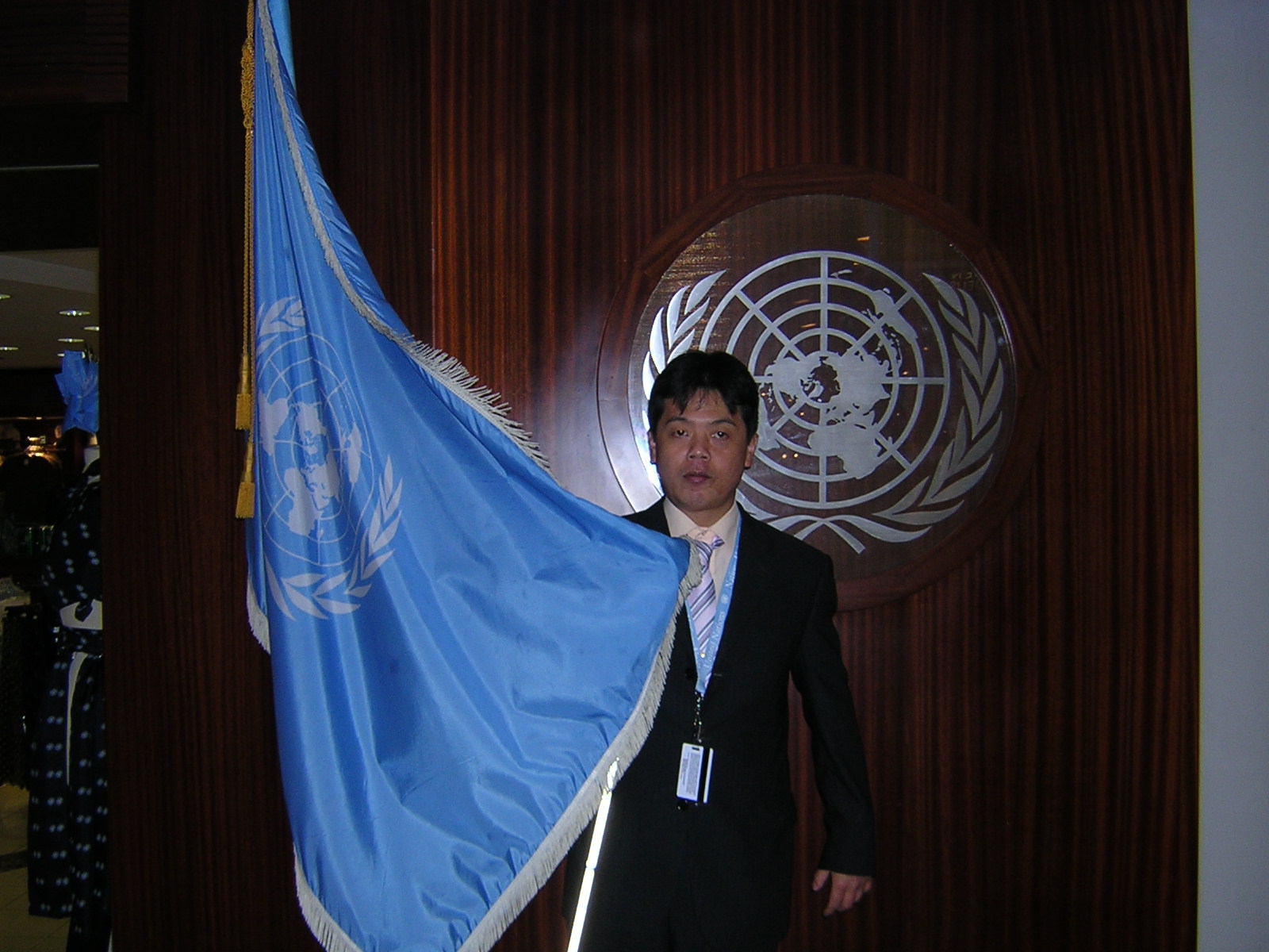 <写真:国連旗と理事長>