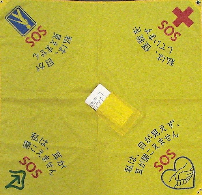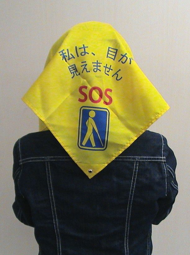 また、そんな方たちを助けたいと思っても、方法がわからず、困ってしまうことも。 この“Help Me!SOS バンダナ”は全ての人が使えるよう四隅に文字が印刷されています。 用途や状況に合わせて、まわりの人が見やすいように首や頭に巻いてご使用頂けます。