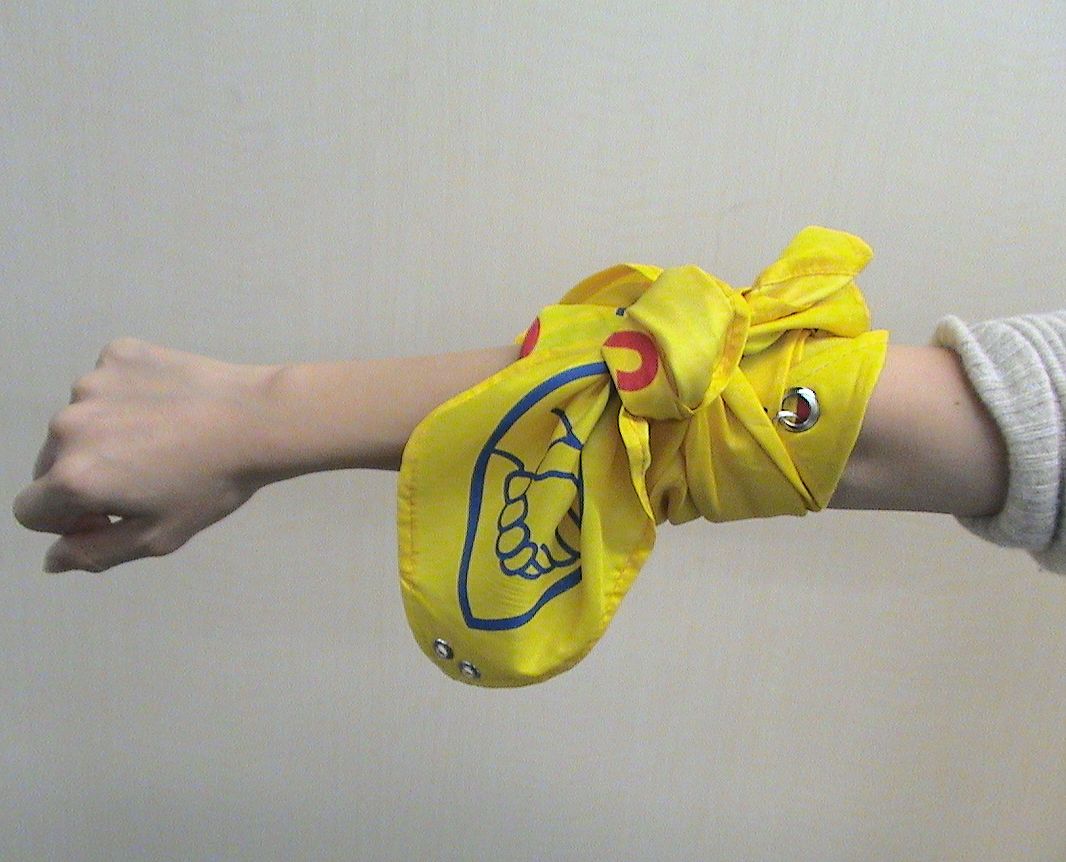 盲ろう者、視覚障害者がさわってわかるように、バンダナの隅に印のハトメがあるのが優れ物!