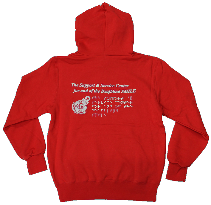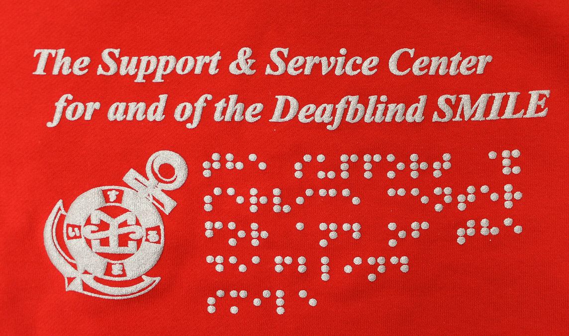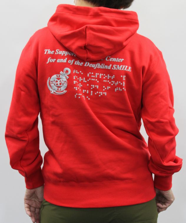後側には活字、指文字、点字で「The Support &Service Center for and of the Deafblind Smile」がプリントされています。また、ロゴマークの「錨」もプリントされ、男女を問わない着やすいデザインに仕上がっています。