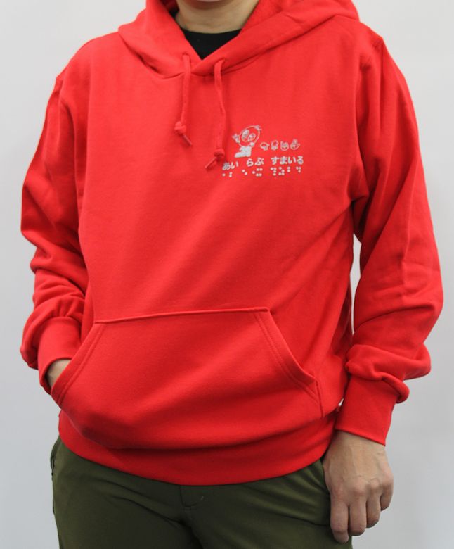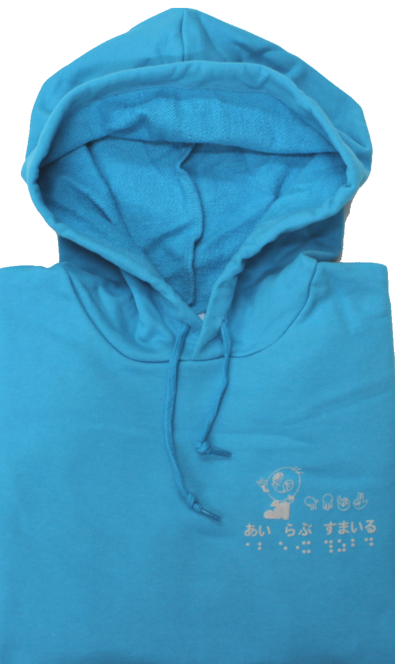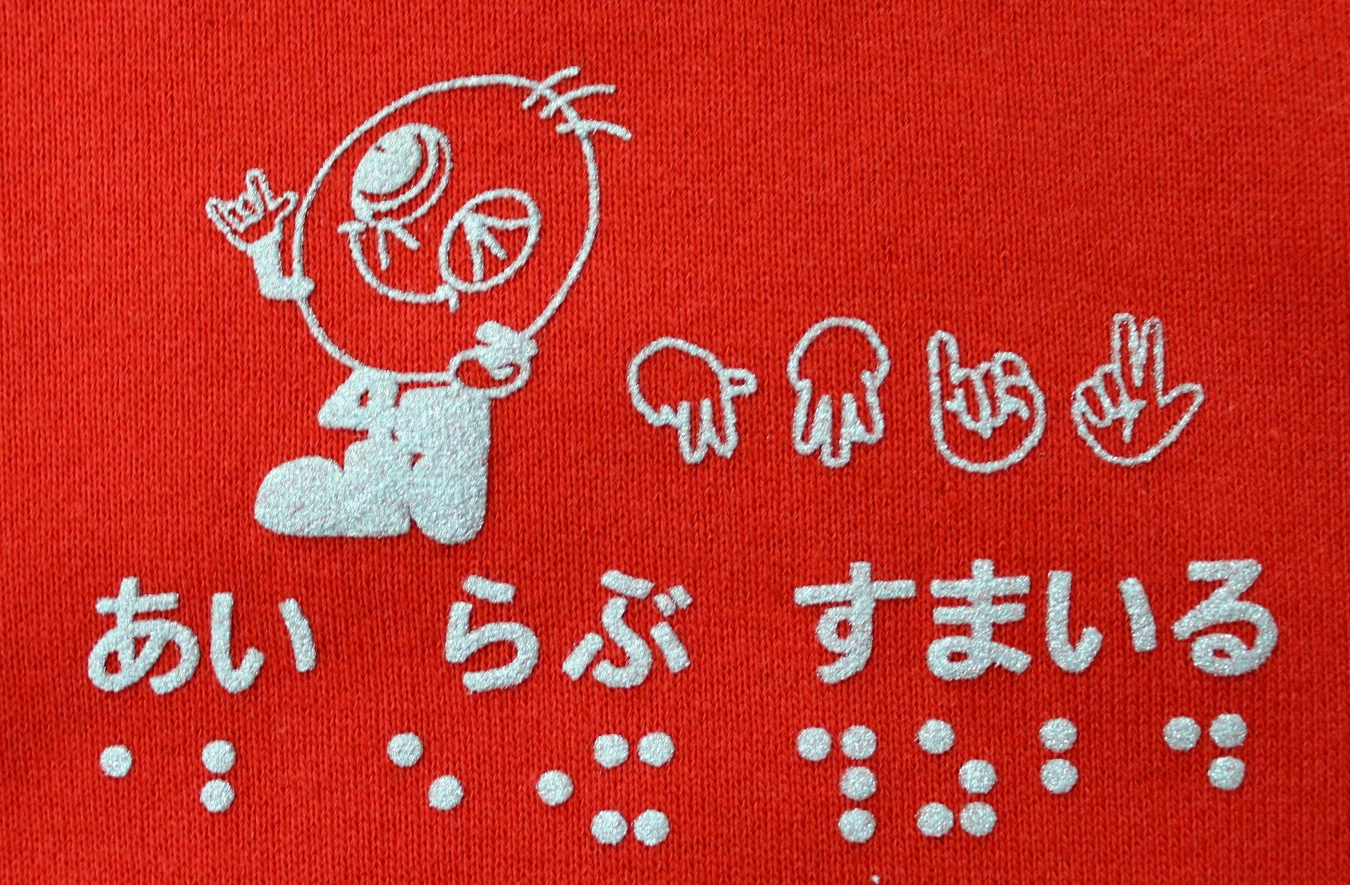 素材は綿100%で、肌ざわり抜群、吸水性に優れています。前側の左胸には活字、指文字、点字でプリントされた「あい らぶ すまいる」とすまいるの絵柄であるすまいる君が描かれています。