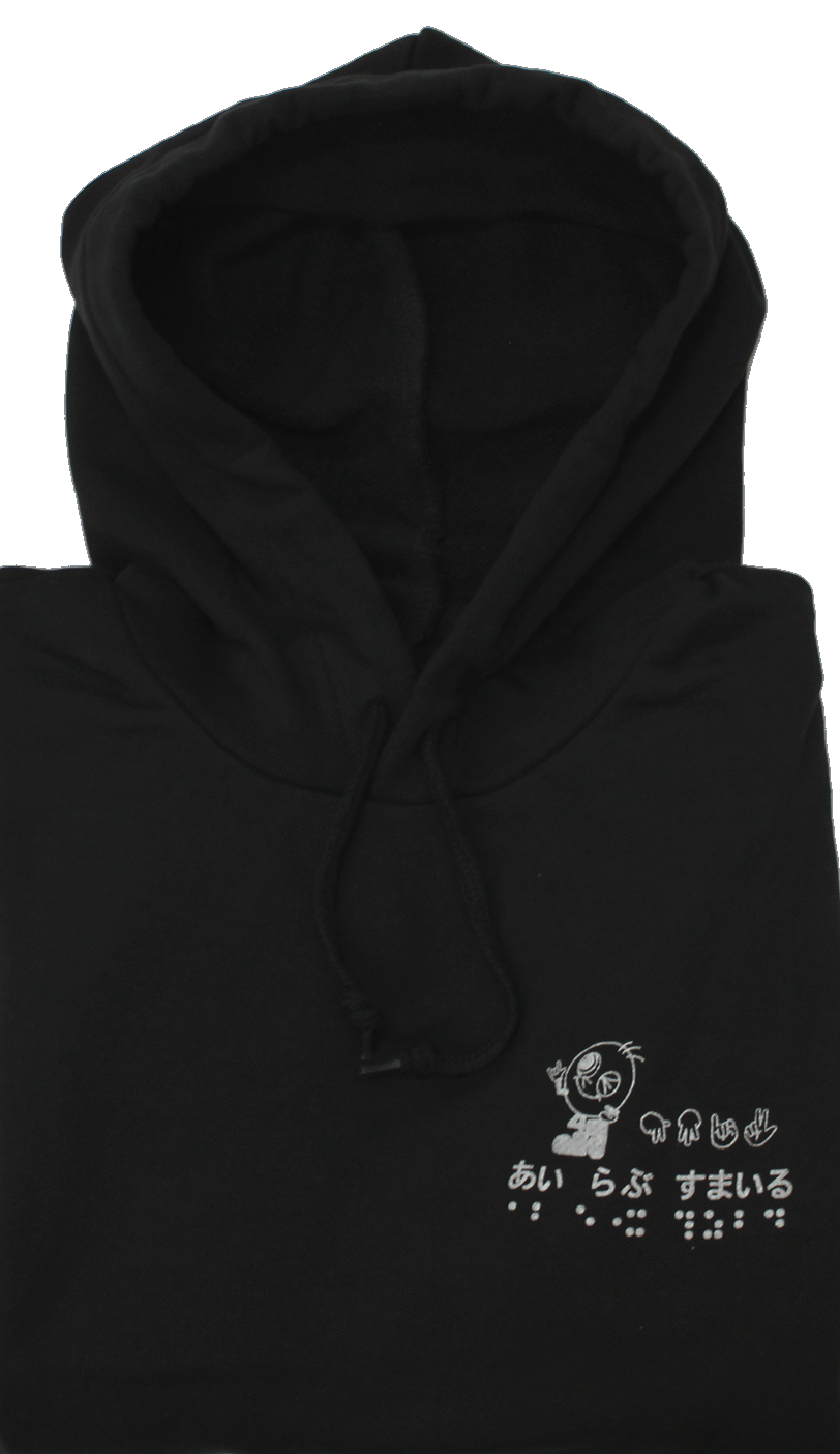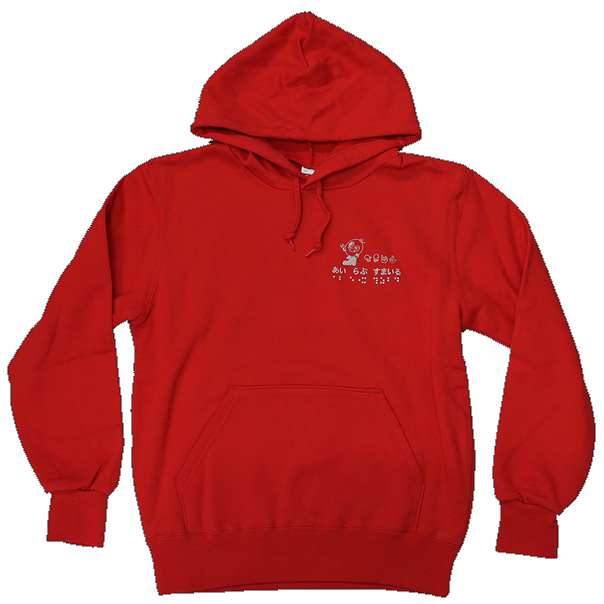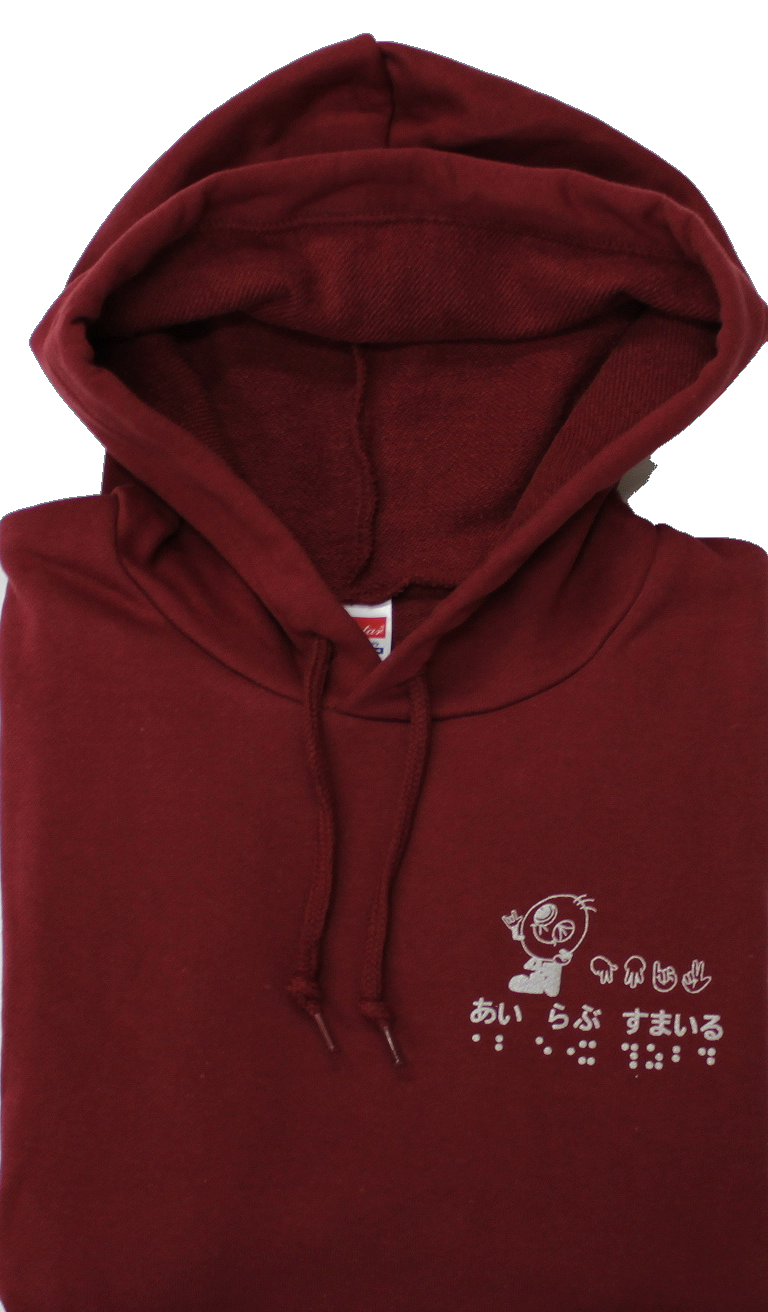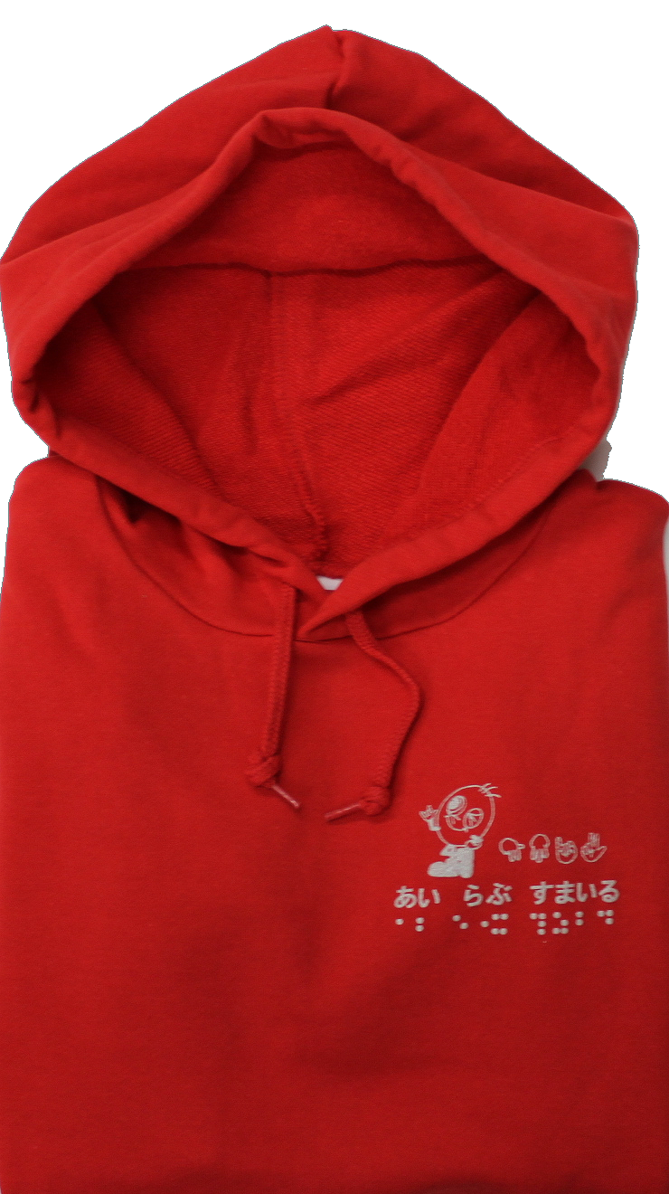 素材は綿100%で、肌ざわり抜群、吸水性に優れています。前側の左胸には活字、指文字、点字でプリントされた「あい らぶ すまいる」とすまいるの絵柄であるすまいる君が描かれています。
