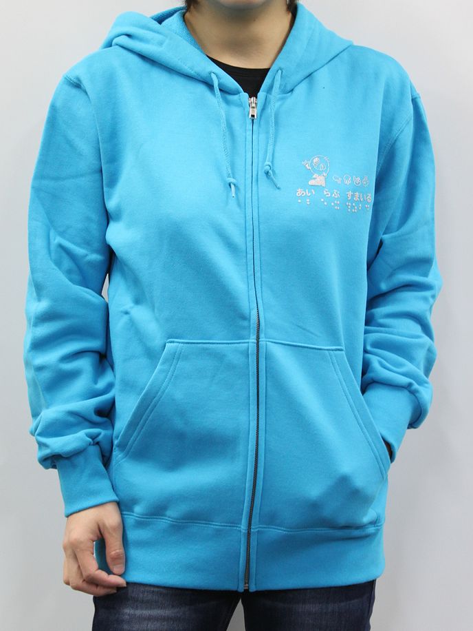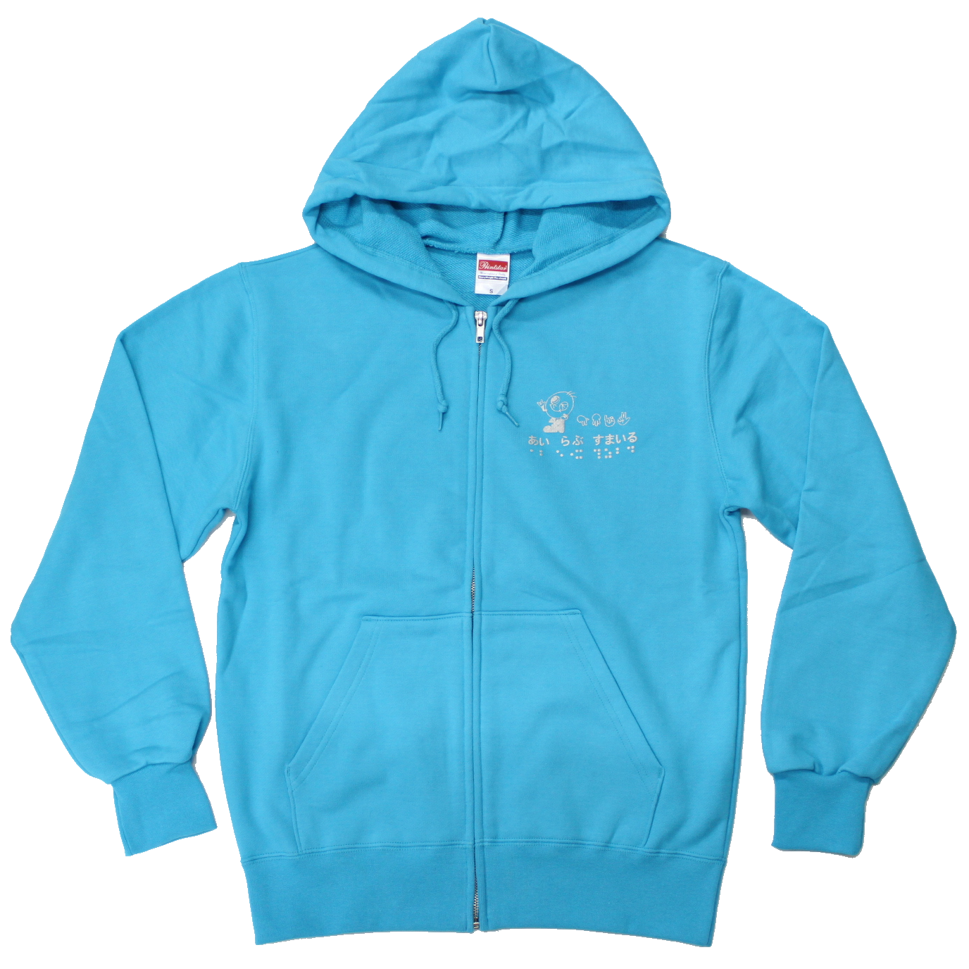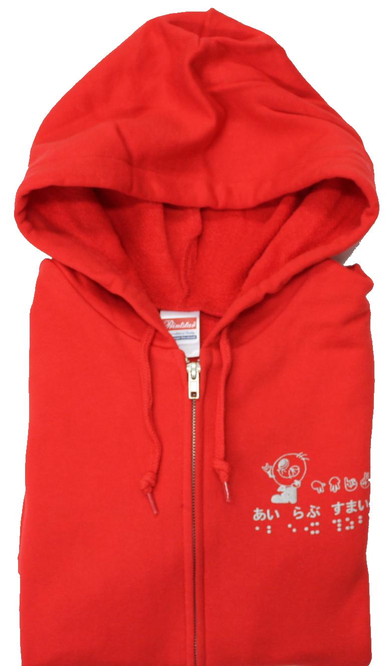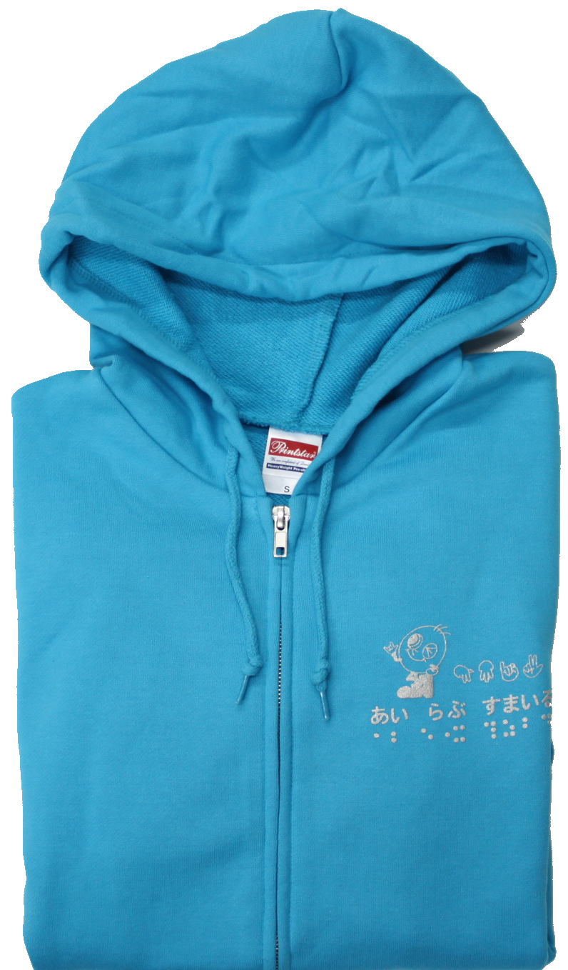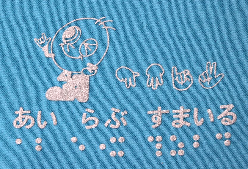 素材は綿100%で、肌ざわり抜群、吸水性に優れています。前側の左胸には活字、指文字、点字でプリントされた「あい らぶ すまいる」とすまいるの絵柄であるすまいる君が描かれています。