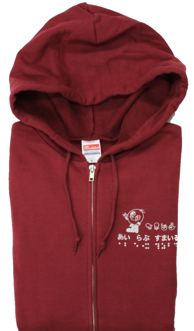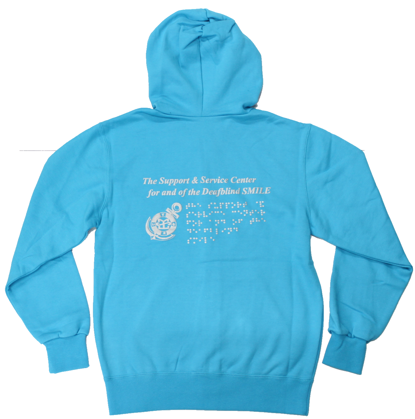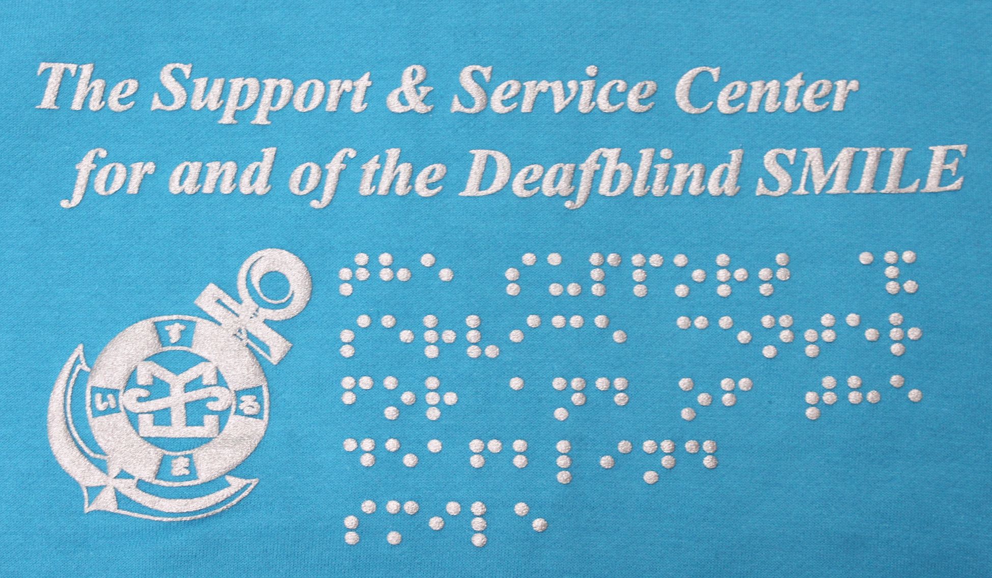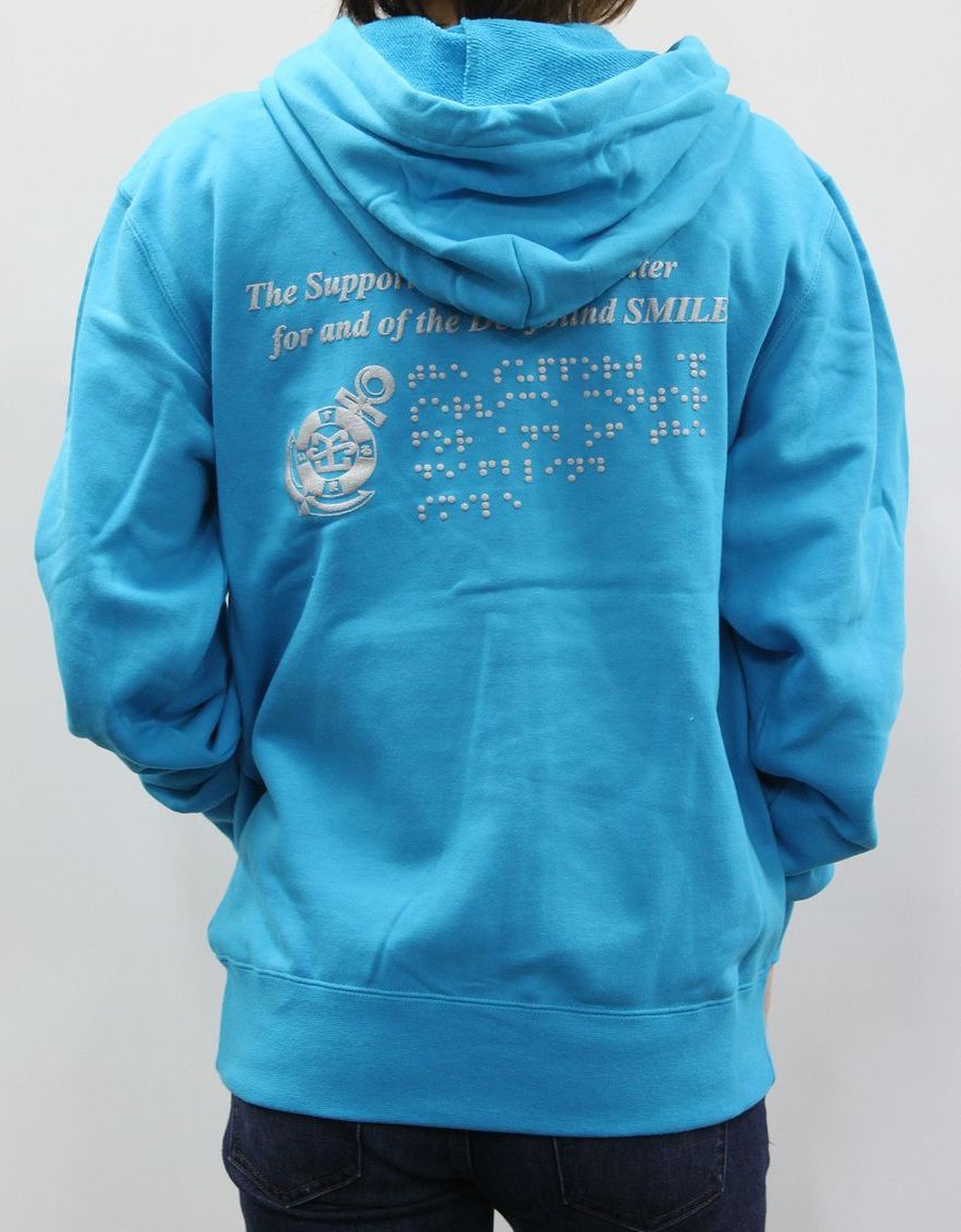後側には活字、指文字、点字で「The Support &Service Center for and of the Deafblind Smile」がプリントされています。また、ロゴマークの「錨」もプリントされ、男女を問わない着やすいデザインに仕上がっています。